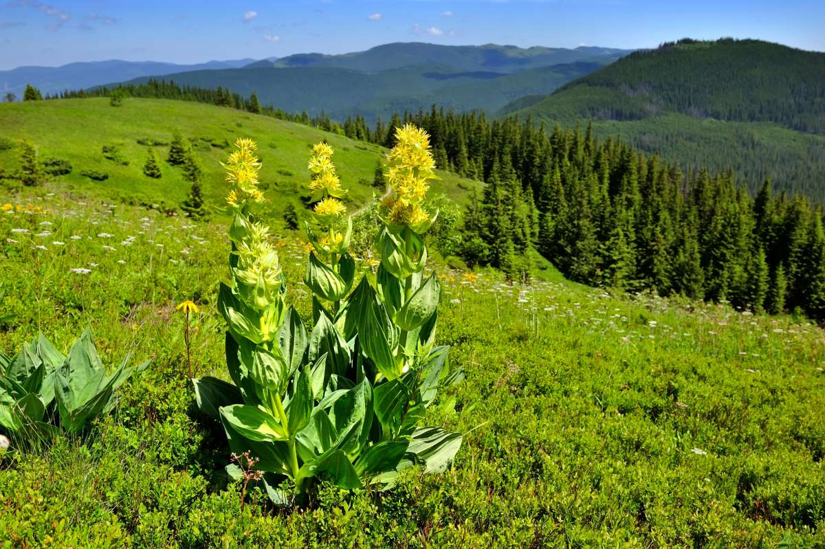 De bloeitijd van een Gele gentiaan ligt in juli en augustus en de bloemen zijn geel van kleur.