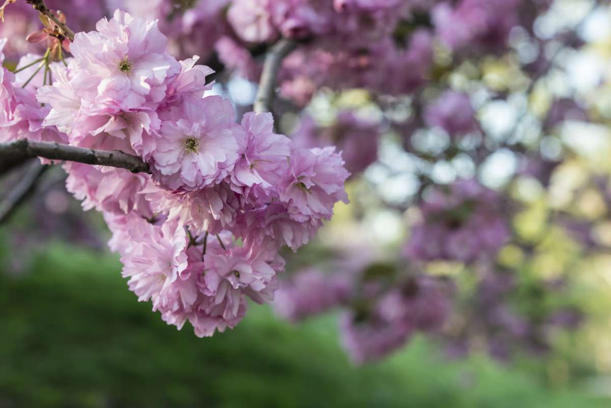 De bloeitijd van een Japanse sierkers ligt in april en mei en de bloemen zijn roze van kleur.