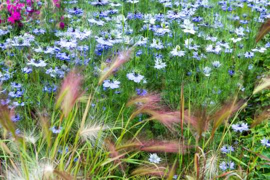 De bloeitijd van een Juffertje-in-het-groen ligt in juli en augustus en de bloemen zijn blauw van kleur.