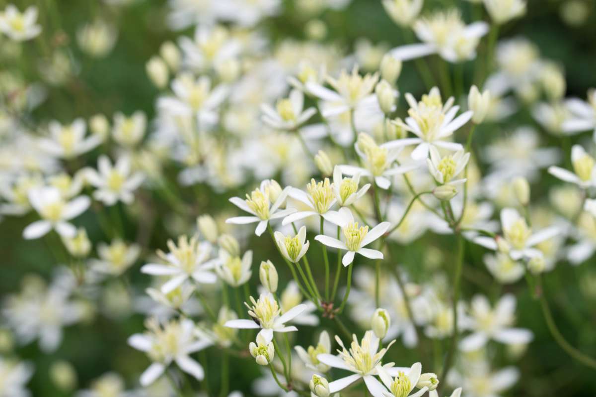 De bloeitijd van een Stijve clematis ligt in juli en augustus en de bloemen zijn wit van kleur.